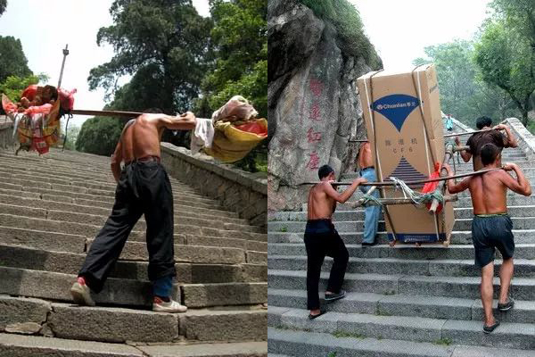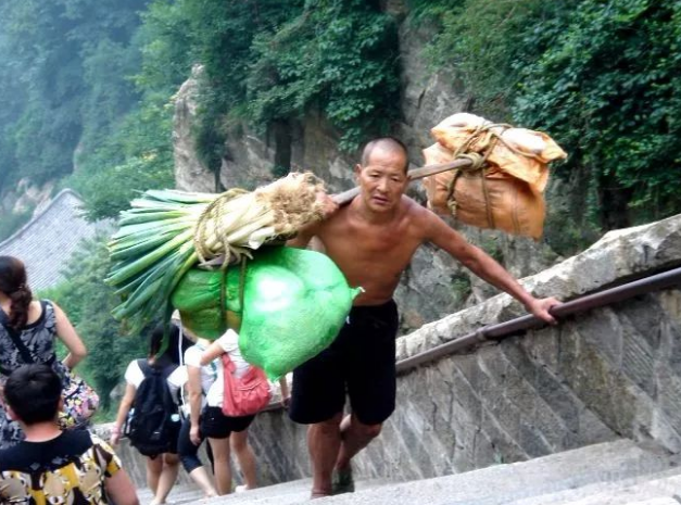 他們的路線是折尺形的從台階的左側起(qǐ)步,斜行向(xiàng)上,登上七八級,到了台階右側,就(jiù)轉過(guò)身子,反方向(xiàng)斜行,到了左側再轉回來,每一次轉身,扁擔換一次肩。擔了重物,如果照一般登山的人那樣直上直下,膝蓋會(huì)受不住的。但是路線曲折,就(jiù)會(huì)使路線加長(cháng)。挑山工登一次山,走的路程大約比遊人多一倍。挑山工,他們將(jiāng)礦泉水,食物,生活用品,甚至建築材料從山腳一擔擔的挑到山上,非常辛苦。