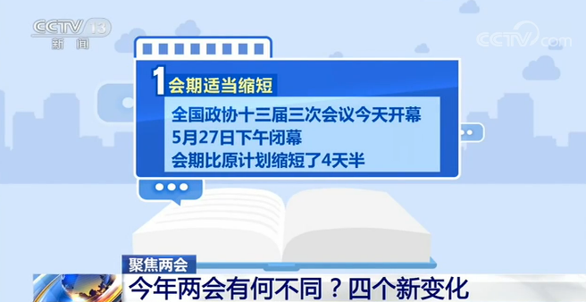 首先,會(huì)期适當縮短,全國(guó)政協十三屆三次會(huì)議今天開(kāi)幕,5月27日下午閉幕,會(huì)期比原計劃縮短了4天半。