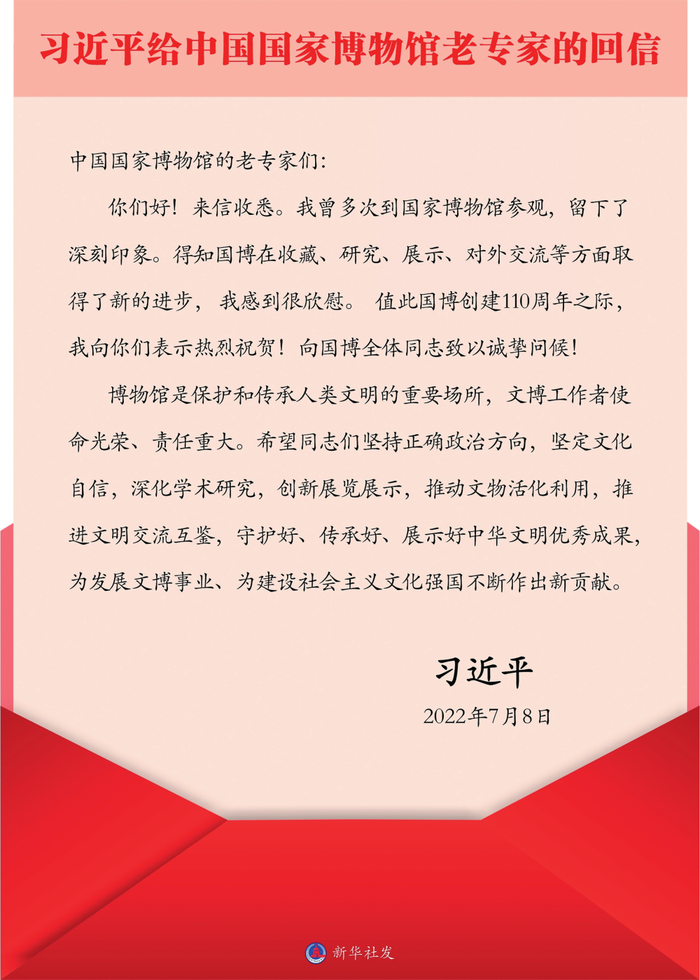 7月8日,中共中央總書記、國(guó)家主席、中央軍委主席習近平給中國(guó)國(guó)家博物館的老專家回信,在國(guó)博創建110周年之際,向(xiàng)國(guó)博全體同志緻以熱烈祝賀和誠摯問候。